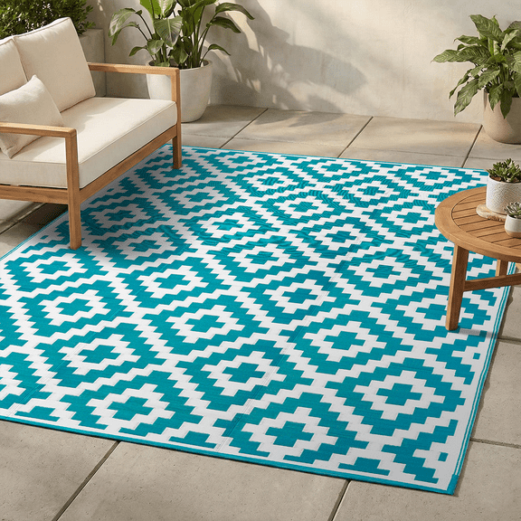 Reduced price FH Home Outdoor Rug - Waterproof, Fade Resistant, Reversible - Premium Recycled Plastic - Geometric - Large Patio, Deck, Sunroom, RV, Camping - Aztec - Teal & White - 9 x 12 ft Foldable From $29.99
