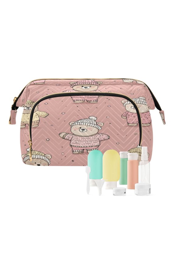 Wavy Quilted Cosmetic Bag Large-Capacity Travel Toiletry Organizer Includes 9-Piece Portable Travel Bottle Set Cute Bear Pattern $22.99