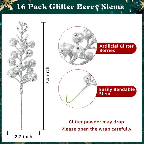 current price $32.08OTGFRF-36Pcs Silver Christmas Glitter Berries Stems, 7.5 Inch Artificial Christmas Picks, Glitter Berry Branches, Berry Holly Picks Stems for Christmas Tree Ornaments, DIY Xmas Wreath Party Home Deco