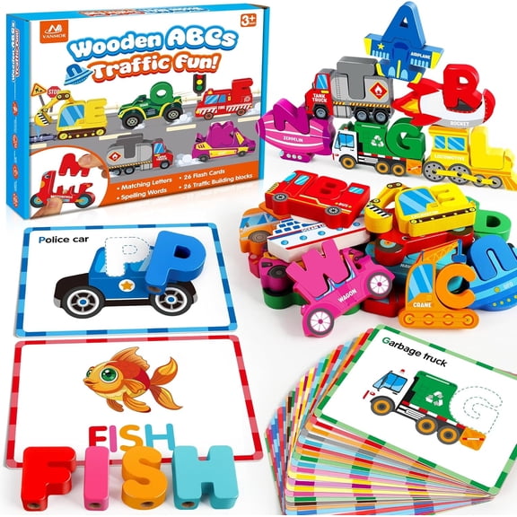 Clearance Vanmor Wooden Vehicle Alphabet Puzzle for Toddlers, Traffic ABC Letter Sight Words Matching Game with 52 Blocks and Flash Cards, Montessori Spelling Game Learning Toys, Stocking Stuffer for Kids 3-5 $25.52 Was $30.99