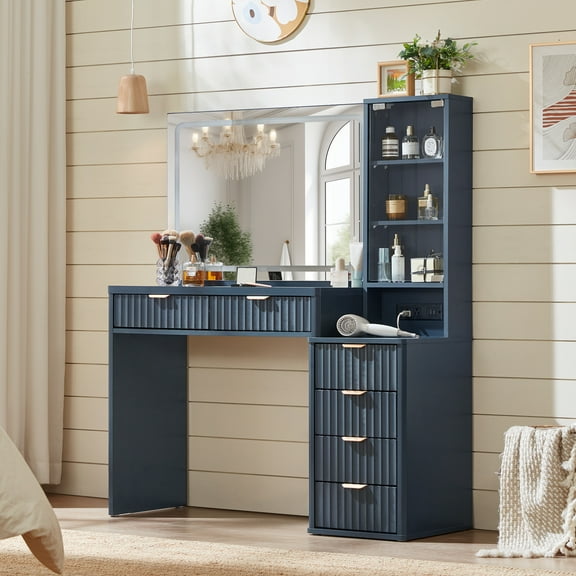 current price $361.19LEYAOYAO Vanity Desk with Mirror and Lights, 43.5'' Fluted Makeup Vanity with 6 Drawers and Adjustable Shelves, Navy Blue Make Up Vanity Wood Dressing Table with Glass Top and Power Outlet