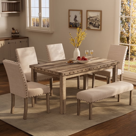 Farmhouse Dining Table Set for 6, Farmhouse Wooden Table & Upholstered Bench & 4 Dining Chairs, Kitchen Dining Set with Nailhead Accents, Rectangular Table Sets for 6 for Kitchen/Dining Room From $269.99