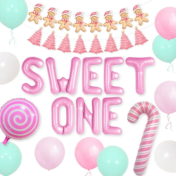 current price $15.99Sweet One Christmas Party Decor Set - Pink Candy Balloon & Banner Kit