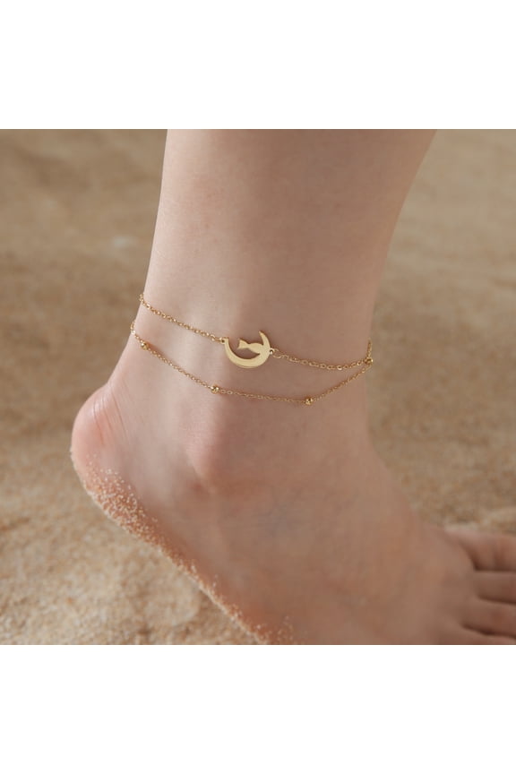 Cute Animal Pendant Anklets For Women Moonlit Squatting Cat 14K Yellow Gold Anklet Double Layer Bead Chain Feet Chain Summer Beach Jewelry From $128.30
