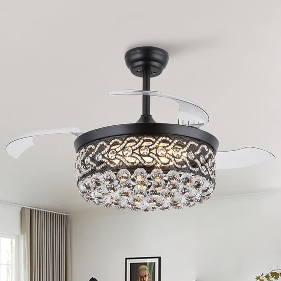 Clearance PHORUS 48" Modern Invisible Crystal Ceiling Fan Chandelier with Light, DC Motor 6-Speed Dimmable Fan with Remote Control, Retractable ABS Blades and Timer,Black From $170.99