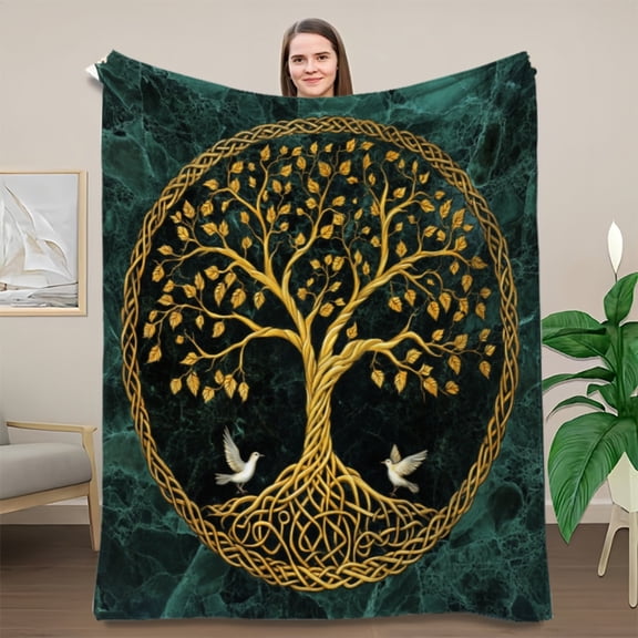 Celtic Tree of Life Flannel Blanket - Heavyweight 280GSM All-Season Throw, Dark Green & Gold Bedspread, Sofa Cover, Non-Fading Polyester, Elegant Home Decor Gift From $6.80
