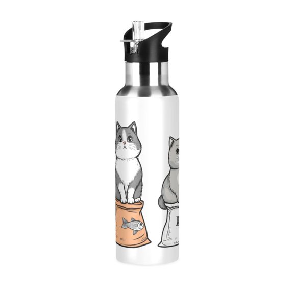 Yayeee 20oz Double Wall Stainless Steel Water Bottle with Flip Straw, Gray Cute Chubby Cat