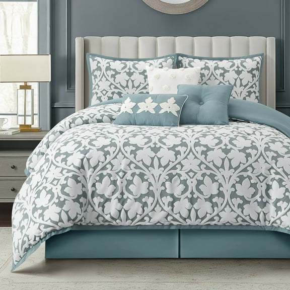 LANCO MODERN LIFESTYLE 7 Pieces Comforter Set, Queen, Blue, Jacquard Floral Pattern and Classy Damask Medallion Design, Ultra Soft, Includes Bed Skirt, Shams and Decorative Pillows From $104.64