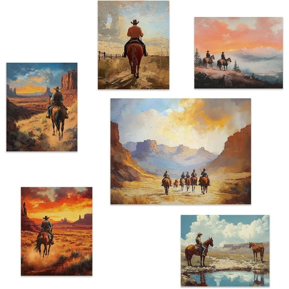 6CS Cowboy Wall Poster Set Western Cowboy Picture Horseback Riding Scene Wall Prints Oil Painting Style Retro Posters $13.39