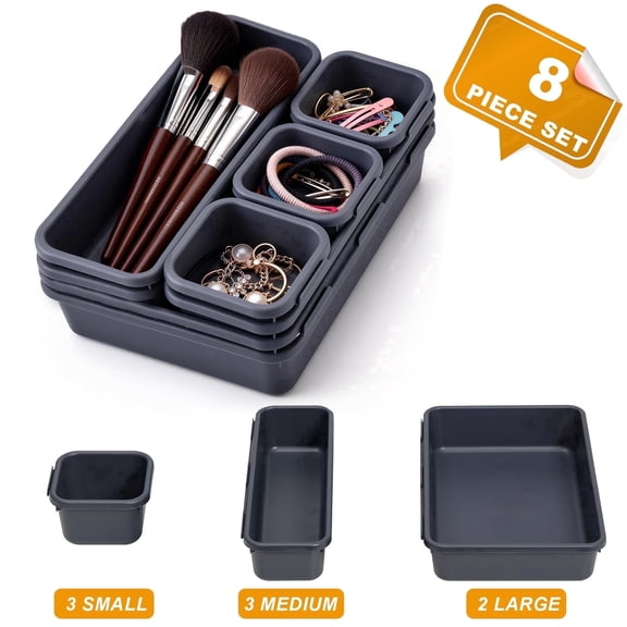 Lockways 8 PCS Drawer Organizer Set, 3 Size Plastic Stackable Vanity Drawer Organizer, Non-Slip Desk Drawer Organizer for Makeup ,Kitchen, Bedroom, Bathroom, Office (Gray) From $10.99