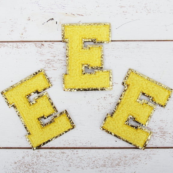 3 Pack Chenille Iron On Glitter Varsity Letter "E" Patches - Yellow Chenille Fabric With Gold Glitter Trim - Sew or Iron on - 8 cm Tall From $9.99