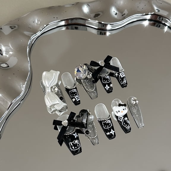 Available in additional 4 optionsPure handmade nail piece, high-end black French Kitty cat manicure, white long bow nail