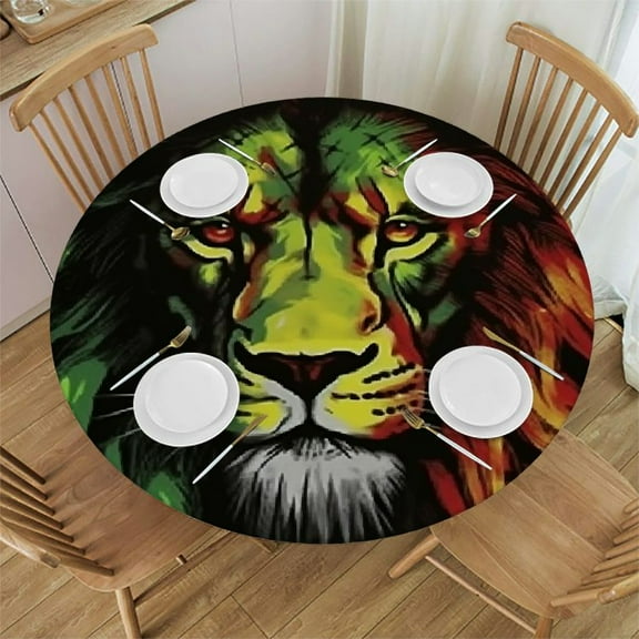 HAOXIT Rasta Tablecloth, Ethiopian Flag Colors on Sketchy Lion Head with Black Backdrop, Dining Room Kitchen Round Table Cover From $14.99