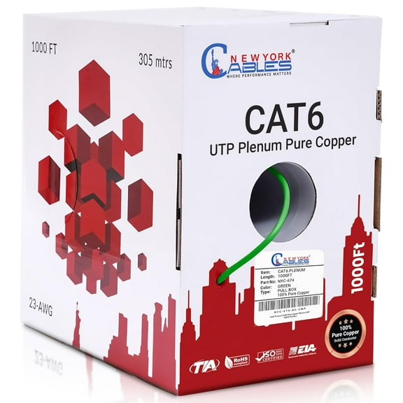 NewYork Cables Cat6 Plenum Pure Copper 1000ft Bulk Ethernet Cable 4P 550MHz 23AWG Green From $174.99