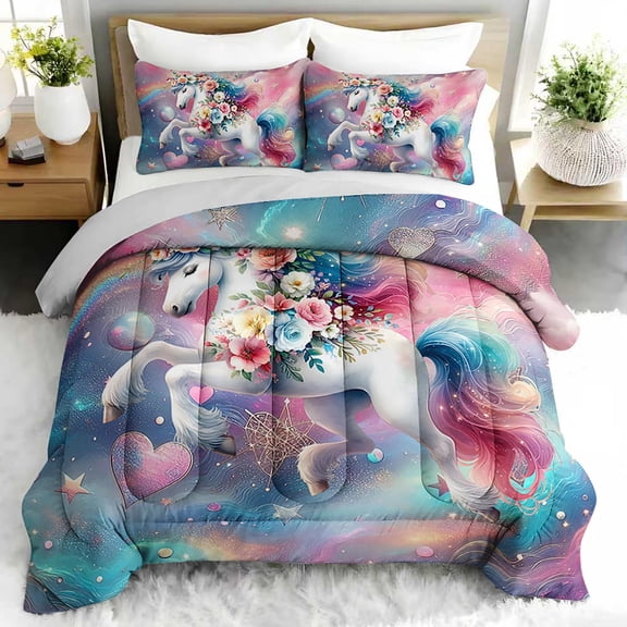 3pcs Unicorn Fantasy Comforter Set, Magical Rainbow Galaxy Bedding Set for Bedroom or Guest Room Decor, All Seasons Quilt Machine Washable Duvet with 2 Pillowcases