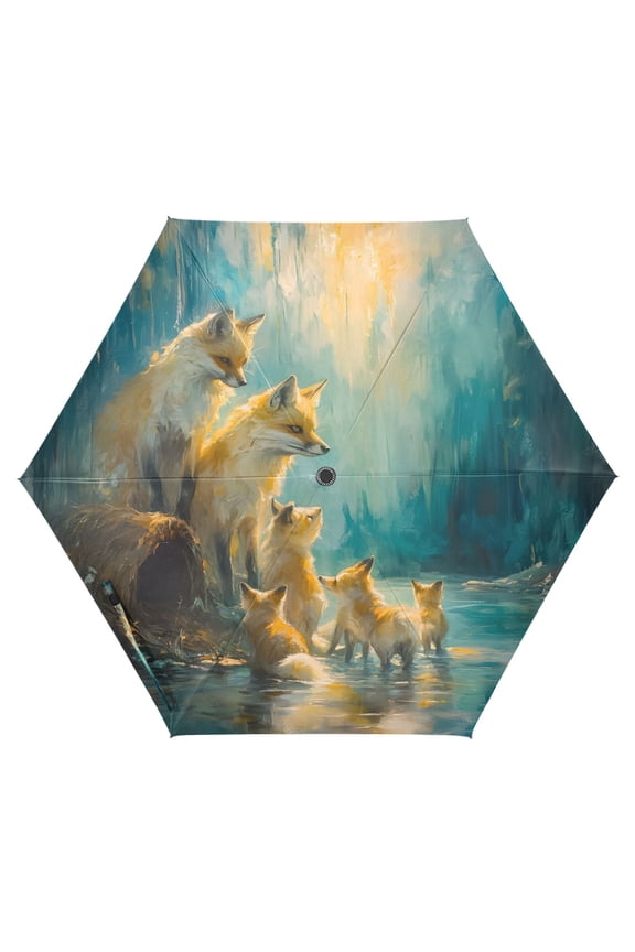 Hand Painted Sleeping Foxes Leaves All Weather Umbrella Triple Folding Parasol 6 Ribs UV Protection PortableBZSMCE Folding Umbrellas Rain & UV Protection Windproof In Stellar Fox Gaze Pattern $27.71