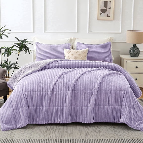 Jessy Home 3 Piece Fleece Queen Comforter Set - Soft & Warm Fluffy Purple Sherpa Bedding , Fuzzy Heavy Double Sided Design Winter Comforter with 2 Pillow Cases