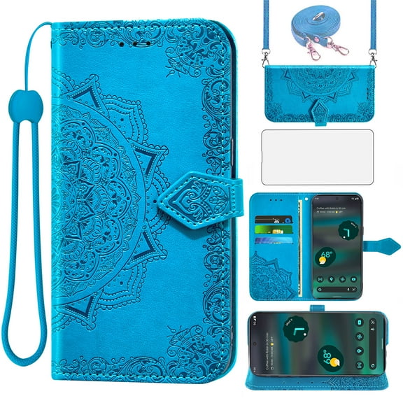 Asuwish Phone Case for Google Pixel 6A 5G 2022 Wallet Faux Cell Cover with Tempered Glass Screen Protector Flip Lanyard Wrist Strap Credit Card Holder Stand Mandala Flower Pixel6A A6 Women Men Blue From $14.99