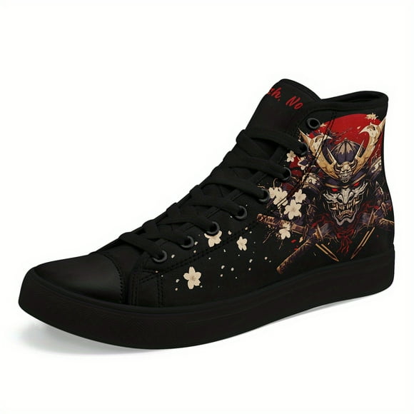 Skull High Top Canvas Sneakers for Men Women, Gothic Floral Print Streetwear Casual Fashion Skate ShoesMen's Japanese Samurai Design High-Top Sneakers - Lightweight Breathable Trainers with Gothic Streetwear Style, Black with Red & Golden Accents, Lace-Up Casual Shoes for Casual Attire