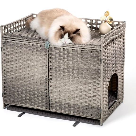 current price $151.98Stylish Rattan Cat Litter Box Enclosure with Fenced Top Includes 2 Mats, Ombre Gray, 30.3L x 18.2W x 24.2H, Doubles as Hall Table"