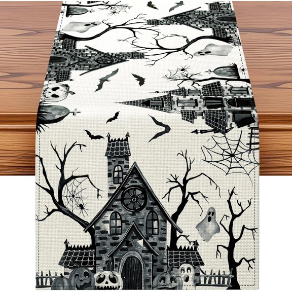 Halloween Haunted House Ghost Pumpkin Linen Table Runner for Holiday Farmhouse Dinner Decor 13x72 inch