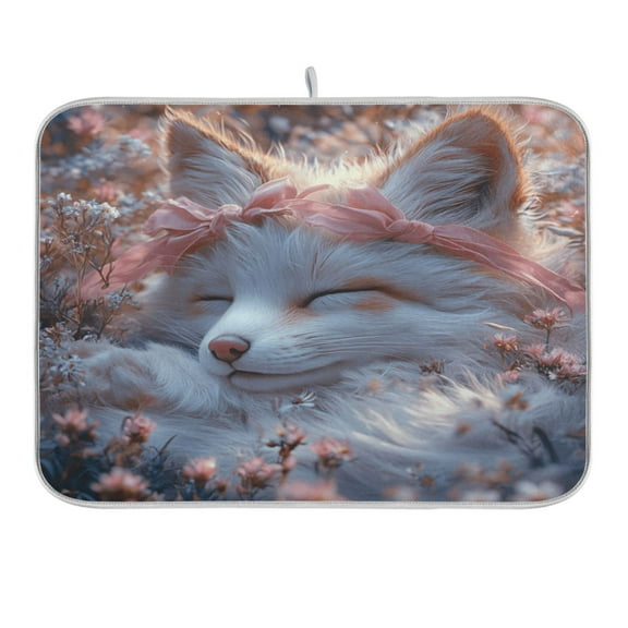 Cute White Fox with Pink Ribbon Dish Drying Mat 16x18 Absorbent Microfiber Draining Rack Pad for Kitchen Counter Sink From $14.99