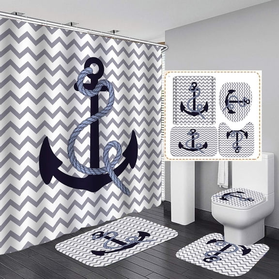 4PCS/Set Anchor Shower Curtain Sets with Rugs Polyester Waterproof Shower Curtain Nautical Anchor Bath Curtain Bathroom Rugs Bath Mat Set Toilet Lid Cover, 72"x72", Infinity Love Anchor