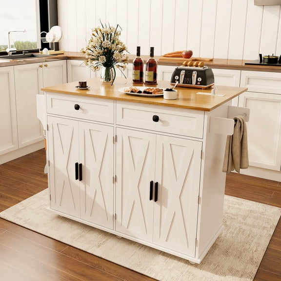 Kitchen Island with Power Outlet, 2 Large Drawers & 2 X-Shaped Double Doors | Rolling Kitchen Cart with Lockable Wheels, Drop-Leaf Table for Storage & Prep Work From $199.99