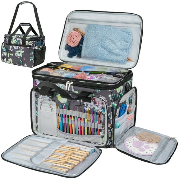 PAVILIA Knitting Bag Yarn Storage Tote, Large Crochet Organizer Bag, Yarn Storage Holder for Crocheting Knitter, Knitting Project Bag, Crochet Accessories Set, Gifts For Crochet Lovers, Floral Gray From $37.99