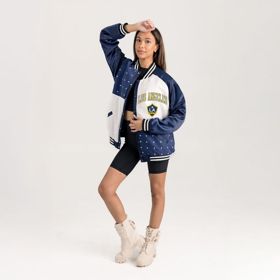 Available in additional 5 optionsWomen's Gameday Couture Navy LA Galaxy Refined Rivalries Rhinestone Raglan Full-Snap Varsity Bomber Jacket