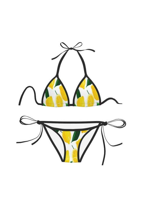 Women Two Piece Swimsuit Sexy Swimwear Halter String Triangle Bikini Sets - Lemon PatternYellow Lemon Leaves Pattern Women's Two Piece Bikini Swimsuit - Adjustable Tie Bikini Set Sexy & Comfortable Beach Swimwear