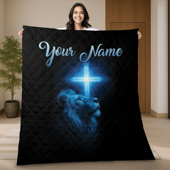 Custom Christian Quilt Blanket with Lion and Cross – Personalized Name Gift for Faith, Religious Quilt, Inspirational Jesus Quilted Coverlet