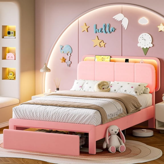 Virans Twin Size Velvet Upholstered Bed Frame with Headboard & Storage Drawers,Princess Platform Bed Frame with Charging Station & LED,No Box Spring Needed,Pink From $129.99