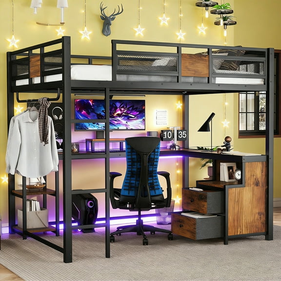 current price $273.00Black Full XL Metal Loft Bed with Desk and Shelves, Loft Bed with Ladder and Guardrails, Loft Bed Frame for BedroomFull XL Metal Loft Bed with Desk and Shelves, Loft Bed with Ladder and Guardrails