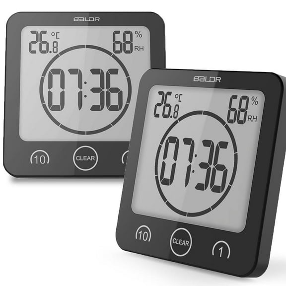 BALDR LCD Waterproof Timer Shower Clock, Bathroom Clock, Wall Clock Battery Operated, Wall Mounted Clock, LCD Clock with Time, Temperature, and Indoor Relative Humidity (Pack of 2, Black) From $39.95