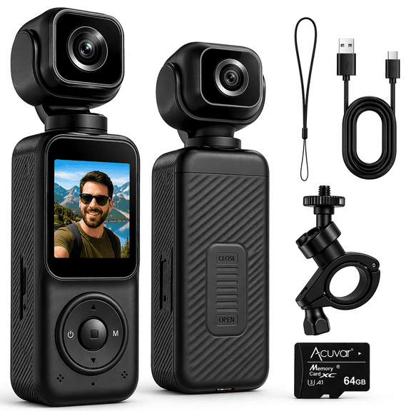 Acuvar 4K Dual Camera Pocket Camera With 3 Axis Gimbal Stabilizer, Vlogging Camera With WiFi, Face Tracking, 270° Rotation And 64GB Card From $44.99