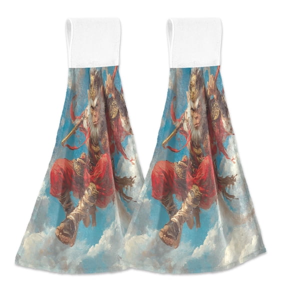 current price $15.992 Pcs Kitchen Hand Towels with Hanging Loops Absorbent Soft Fast Drying Decor Bath Towels Monkey King with Golden Cudgel