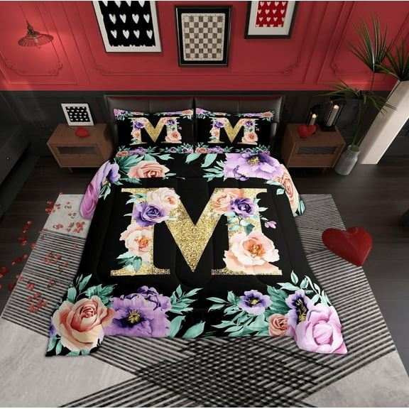 Erosebridal Purple Rose Bedding Twin Comforter Set, Initial Letter M Down Comforter, Cartoon Monogrammed Reversible Comforters & Duvets, Lightweight Bedroom Decoration, 2pcs From $43.69