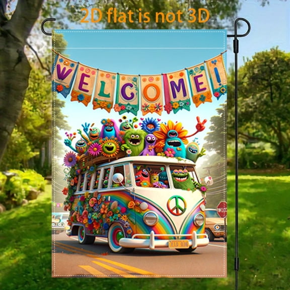 current price $7.992D plane, 1 2D plane Monster Bus welcome theme flag courtyard, vertical double-sided garden decoration of the flag, Monster Bus welcome garden flag, indoor and outdoor decoration trend theme 12x18 in