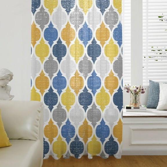 Yellow Blue Morocco Pattern Semi Sheer Curtains Drapes for Living Room, Bedroom, French Doors Window 45 Inches Long, Modern Moroccan Geometric Rod Pocket Chiffon Curtain Drapery Voile Drape Panel From $25.99
