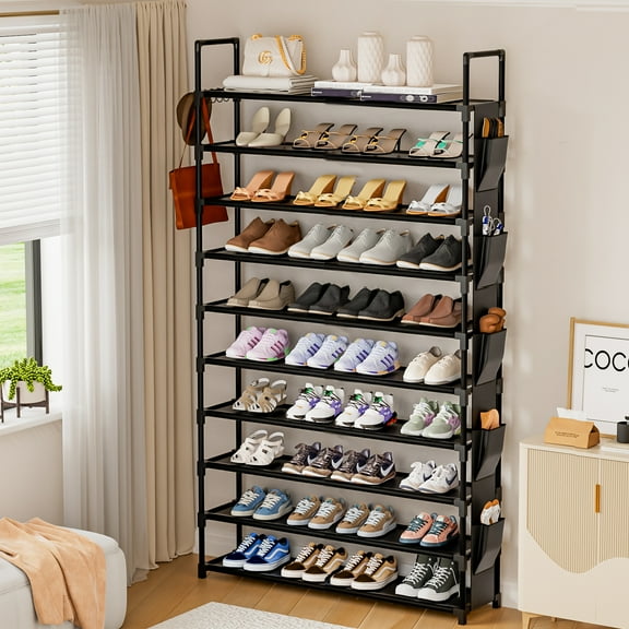 10 Tier Tall Shoe Rack with 5 Hooks and Pocket, Sturdy Shoe Storage Organizer for Closet, Large Capacity Space Saving Shoe Shelf for Garage From $28.49