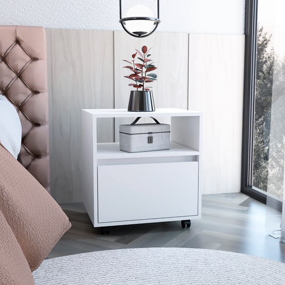 Wasilla Modern White Nightstand with 1 Drawer, Shelf & Casters