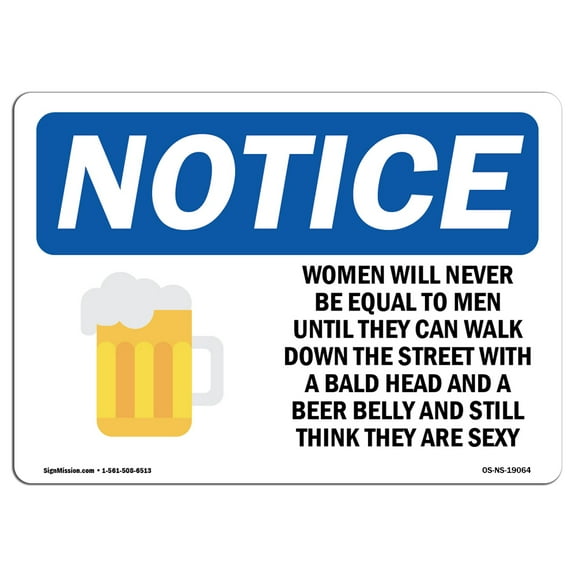 OSHA Notice Sign - Women Will Never Be Equal To Sign With Symbol | Decal | Protect Your Business, Construction Site | Made in the USA From $8.99