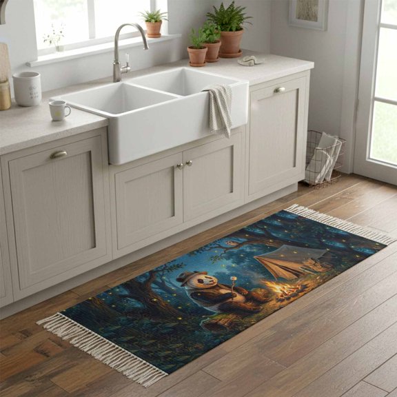 Kitchen Runner Rugs, Camping Bonfire Panda 2'x6' Throw Rug with Tassels, Nighttime Firefly Owl Washable Soft Floor Carpet Runner for Hallway Bedroom Bathroom Laundry Room From $54.49