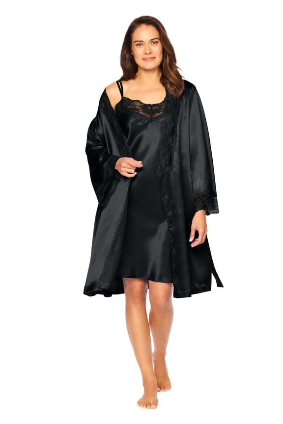 Mid length silky charmeuse & eyelash lace Robe.Shadowline Silhouette Long Lace Nightgown and Robe Set 55737/55737X