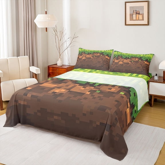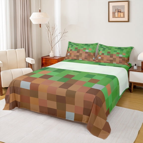 Feelyou Pixel Grid Miners Twin Sheet Sets, Video Games Plaid Lattice Twin Fitted Sheet, Modern Check Green Brown Flat Sheet, Ultra Soft Bedroom Decor, 3pcs