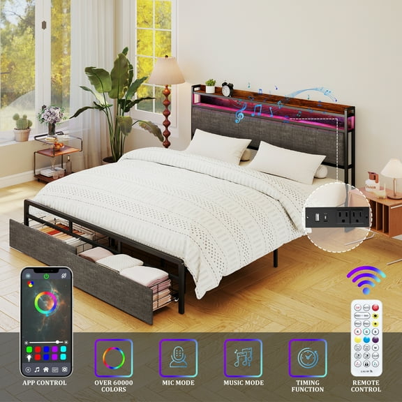 Reduced price Furnibear LED King Bed Frame with Upholstered Storage Headboard and Drawers, LED Platform Bed with Charging Station, No Box Spring Needed From $159.99