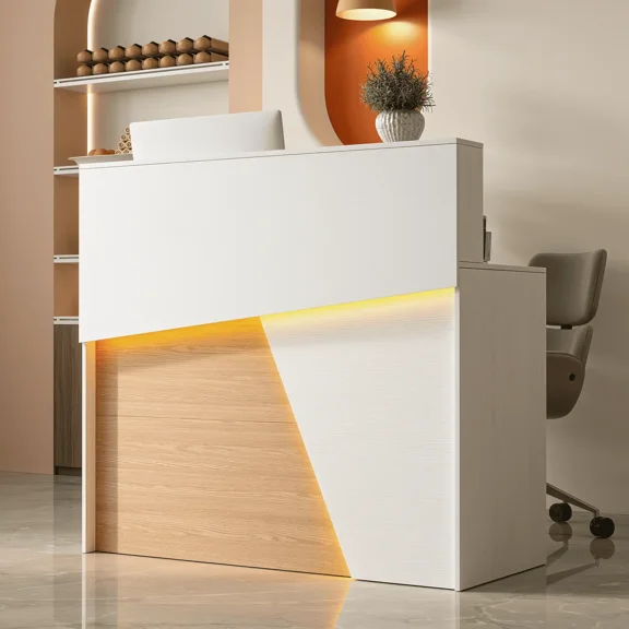 RichYa 47.24"W Reception Desk with LED Lights & Power Outlets,Modern White Reception Counter with 2-Tier Shelf Storage for Office,Retail Store(B) From $209.99
