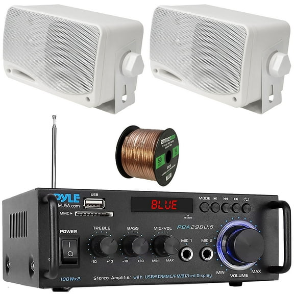 Pyle PDA29BU.6 Bluetooth USB/SD/FM Compact Power Stereo Home Audio Amplifier Receiver, 2x Pyle PLMR24 3.5'' 200W Max Power 3-Way Weather Proof Mini Box White Speakers, 50 Feet 16 Gauge Speaker Wire $89.99