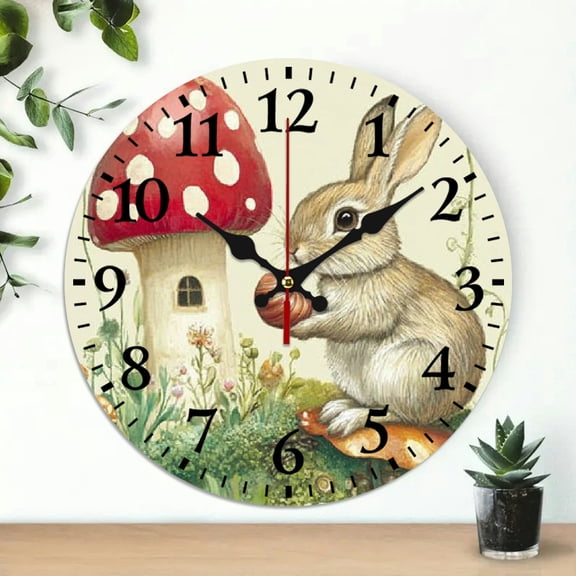 YILUYINQING 10 Inch Wooden Wall Clock Rabbit Mushroom Snail Print Battery Operated Wall Art Decor 10x10in